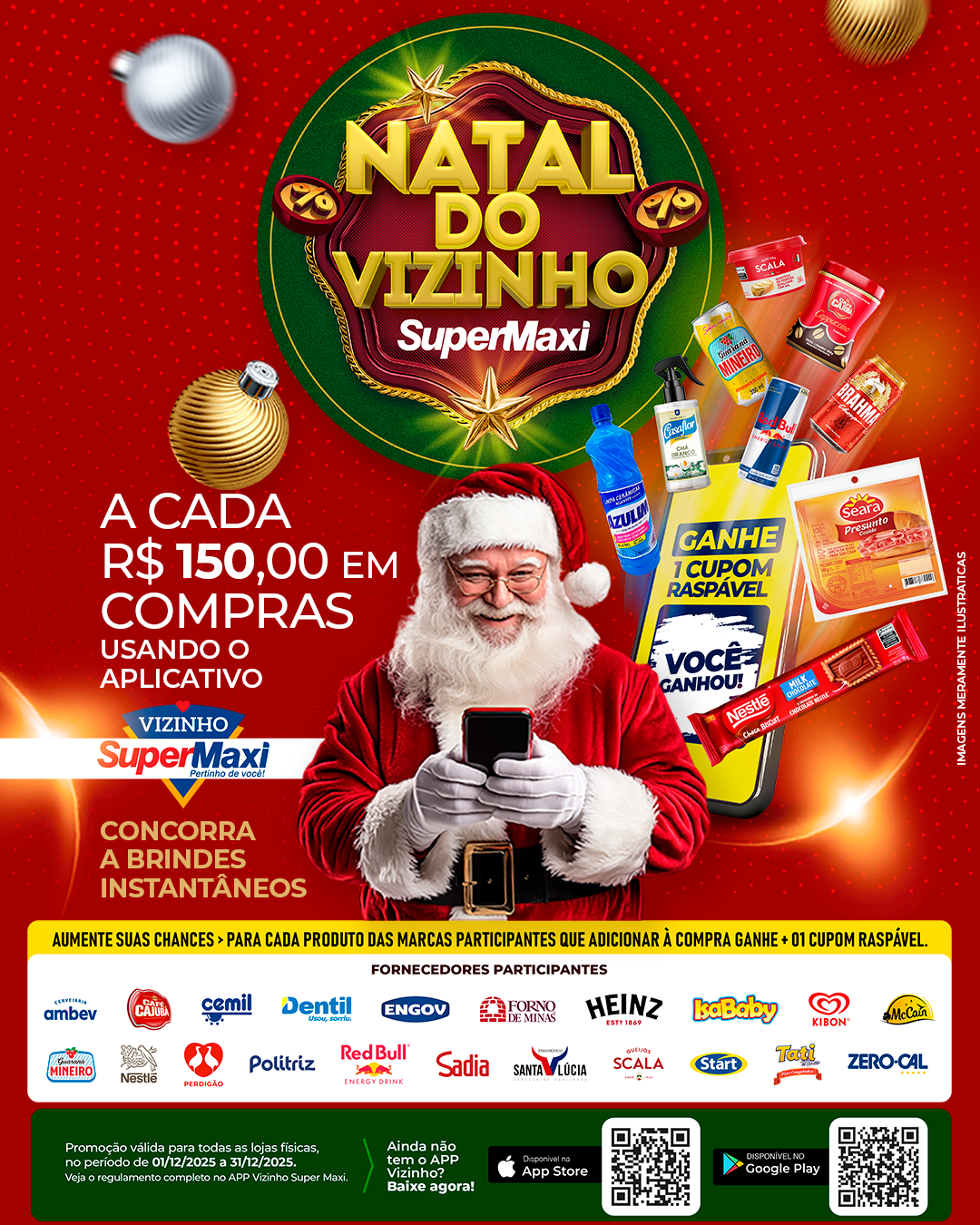 Os consumidores que comprarem, a partir de R$150,00 em produtos, NO MESMO CUPOM FISCAL, terão direito a 1 cupom digital raspável, no APP Vizinho Super Maxi para concorrer aos prêmios da promoção, sendo desprezados os valores excedentes para acúmulo de novos cupons.